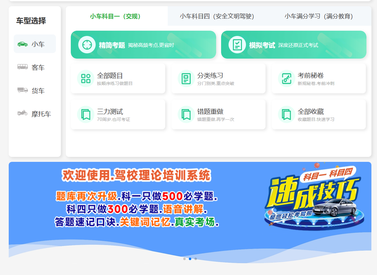 快通驾考产品提供有国内通用和地方题库,并面向学员推出VIP课程;VIP课程涵盖科目一科目四理论知识、科目二科目三实操技能学习,直击考点,形式灵活,生动易懂,帮助学员更有效学习、记忆驾考知识;提供有精心打磨的科目二科目三考点视频,帮助学员正确学习与掌握驾驶基础、实际操作技能,增质内容服务;助力学员提高考试通过率。开通后,即可享受全部题目的答题技巧、视频讲解、智能模拟考试等权益 。